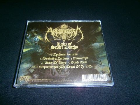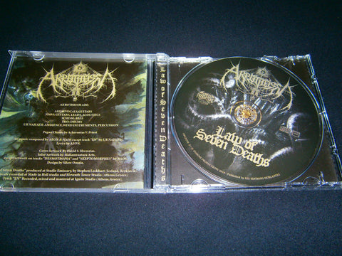 Akrotheism - Law of Seven Deaths. CD format of their 2019 2nd full length album with 7 tracks of Black Metal from Greece. Limited Edition comes with 12 pages booklet lyrics included. Sealed Item. Recommended for fans of Nightbringer, Varathron and Funeral Mist.