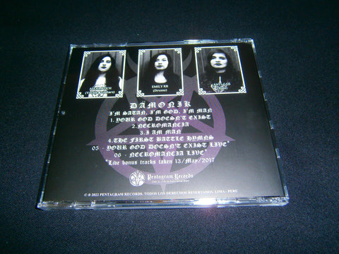 Damonik - I'm Satan, I'm God, I'm Man. 2022 reissue on CD format of their 2018 EP with 6 tracks (including bonus) of Black Thrash Metal from Peru. Limited Edition to 300 copies comes with 4 pages booklet lyrics included and obi strip. Sealed Item. Recommended for fans of Absu, Mythic and Aura Noir.