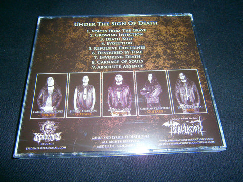 Death Kult - Under the Sign of Death. CD format of their 2017 2nd full length album with 9 tracks of Intense Death Metal from Colombia. Limited Edition to 300 copies comes with slipcase and 12 pages booklet lyrics included. Sealed Item. Recommended for fans of Morgoth, Masacre and Headhunter DC.