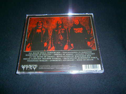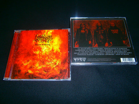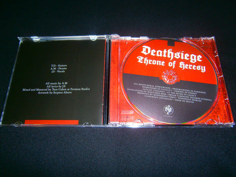 Deathsiege - Throne of Heresy. CD format of their 2022 first full length album with 12 tracks of Death Black Metal from Israel. Limited Edition comes with 8 pages booklet lyrics included. Sealed Item. Recommended for fans of Perdition Temple, Impiety and Angelcorpse.