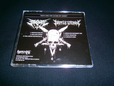 Fetid Zombie / Battlestorm - Defiling the Altar of Gods. Split CD format released in 2012 between the Death Metal Fetid Zombie and the Black Death Thrash Metal Battlestorm from Singapore with 3 tracks from each band. Limited Edition comes with 4-folded panels lyrics included. Sealed Item. Recommended for fans of Sodom, Impiety and Macabre.