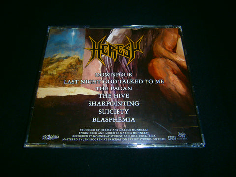 Heresy - Blasphemia. CD format of their 2018 2nd full length album with 7 tracks of Thrash Metal from Costa Rica. Limited Edition comes with 8 pages booklet lyrics included. Sealed Item. Recommended for fans of Exodus, Kreator and Tankard.