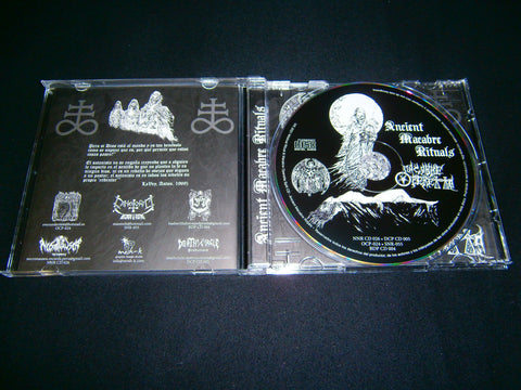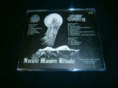 Macabre Operetta / Mistical Ritual - Ancient Macabre Rituals. 2022 split CD format between the Costa Rican Occult Black Metal Macabre Operetta and the Black Metal Mistical Ritual from Mexico. Includes: Mistical Ritual demo 1993 and Macabre Operetta - rehearsal demo 1995 + live 2000. Limited Edition comes with 4-folded panels. Sealed Item. Recommended for fans of Black Funeral, Funereal Moon and Mutiilation.