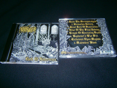 Necromutilator - Oath of Abhorrence. CD format of their 2022 3rd full length album with 8 tracks of Black Thrash Death Metal from Italy. Limited Edition comes with 12 pages booklet lyrics included. Sealed Item. Recommended for fans of Bestial Warlust, Order from Chaos and Corpse Molestation.