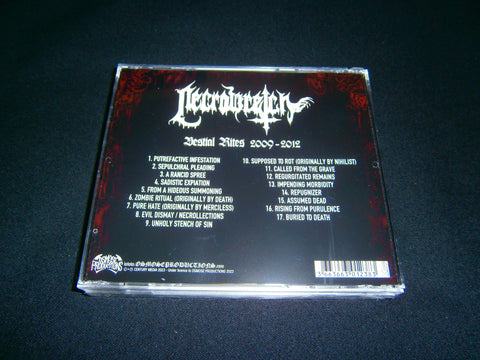 Necrowretch - Bestial Rites. 2023 reissue on CD format of their infamous 2013 compilation with 17 tracks of Death Black Metal from France. Limited Edition comes with 4 folded pages booklet. Sealed Item. Recommended for fans of Shub Niggurath, God Dethroned and Necrophobic.