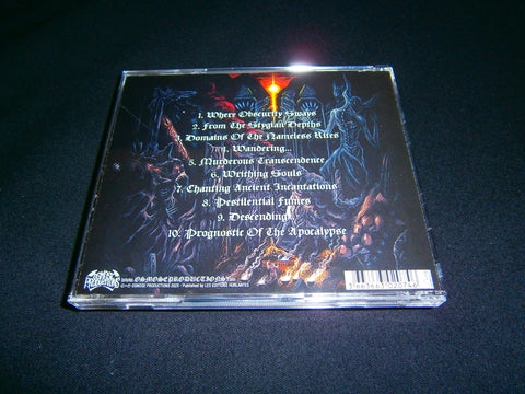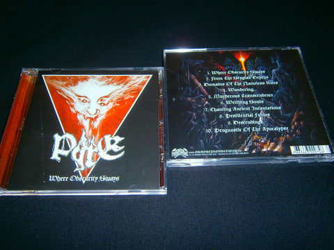 Pyre - Where Obscurity Sways. CD format of their 2025 3rd full length album with 10 tracks of Death Metal from Russia. Limited Edition comes with 8 pages booklet lyrics included. Sealed Item. Recommended for fans of Nihilist, Grave and Repugnant.