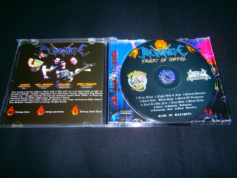 Revenge - Trust in Metal. 2021 reissue on CD format of their 2020 8th full length album includes the 2019 Nocturnal Cult EP as bonus, making a total of 13 tracks of Speed Heavy Metal from Colombia. Limited Edition comes with 8 folded panels lyrics included. Sealed Item. Recommended for fans of Attomica, Exciter and Raven.