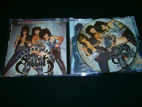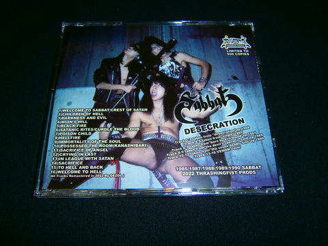 Sabbat - Desecration. 2022 reissue on CD format of their infamous 1988 Desecration EP + includes as bonus the 1985 Sabbat EP + 1987 EP Born by Evil Blood + 1989 EP The Devil's Sperm is Cold + 1990 EP The Seven Deadly Sins + 3 Venom covers, making a total of 16 tracks of Dirty Black Thrash Metal from Japan. Limited Edition to 500 copies comes with 8-folded panels. Sealed Item. Essential for Collectors and Recommended for fans of Barbatos, Sodom and Venom.
