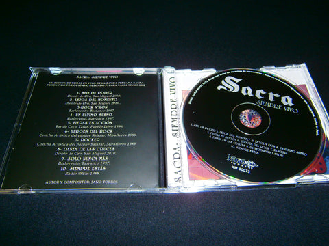 Sacra - Siempre Vivo. CD format of their 2022 live album with 10 tracks of Heavy Hard Rock Metal from Peru recorded between 1988 -2010. Limited Edition comes with three-folded panels. Sealed Item. Essential for Collectors and Recommended for fans of Gilman, Baron Rojo and Scorpions.