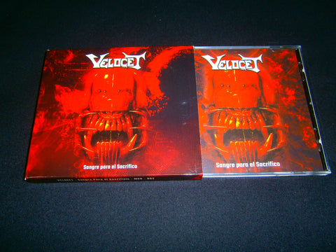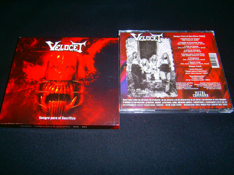 Velocet - Sangre para el Sacrificio. 2023 reissue on CD format that included the 1993 EP Sangre para el Sacrificio + 1992 EP Horas Muertas + 1994 EP Autoeliminacion, making a total of 11 tracks of Thrash Metal from Argentina. Limited Edition comes with 8 pages booklet lyrics included + slipcase and poster. Sealed Item. Essential for Collectors and Recommended for fans of Testament, Lethal and Megadeth.