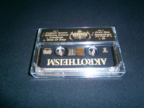 Akrotheism - Law of Seven Deaths. Pro Tape format of their 2019 2nd full length album with 7 tracks of Black Metal from Greece. Limited Edition to 100 copies comes with 6 panels J-Card lyrics included. Sealed Item. Recommended for fans of Nightbringer, Varathron and Funeral Mist.