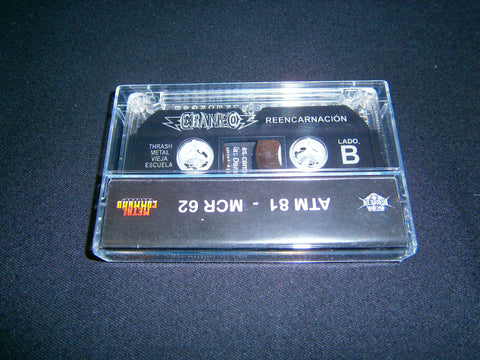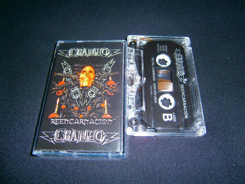 Craneo - Reencarnacion. Tape format of their 2024 first full length album with 9 tracks of Thrash Metal from Argentina. Limited Edition comes with 6 panels J-Card lyrics included. Sealed Item. Recommended for fans of Lethal, Nepal and Exodus.