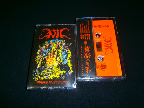 Evil - Buried Alive. Pro Tape format of their 2024 demo with 5 tracks of Evil Thrash Black Metal from Japan. Limited Edition comes with 4 panels J-Card with Japanese lyrics included. Sealed Item. Highly Recommended for fans of Abigail, Hellripper and Bafomet.