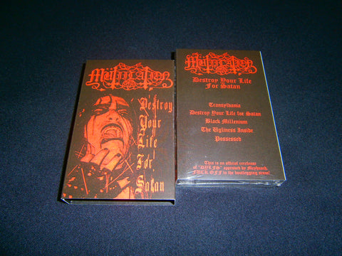 Mutiilation - Destroy your Life for Satan. 2024 reissue on pro Tape format of their infamous 2001 6th demo with 5 tracks of Black Metal from France. Limited Edition comes with 5 panels J-Card lyrics included and slipcase. Sealed Item. Essential for Collector and Recommended for fans of Vlad Tepes, Drowning the Light and Moonblood.