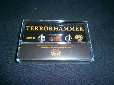Terrorhammer - Gateways to Hades. Pro Tape format of their 2022 2nd full length album with 9 tracks of Speed Black Thrash Metal from Serbia. Limited Edition comes with 9 panels J-Card lyrics included. Sealed Item. Recommended for fans of Speedwolf, Toxic Holocaust and Cruel Force.