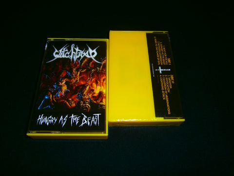 Witchtrap - Hungry as the Beasts. Pro Tape format of their 2024 6th full length album with 8 tracks of Black Thrash Metal from Colombia. Limited Edition comes with 7 panels J-Card lyrics included. Sealed Item. Recommended for fans of Deathhammer, Sodom and Cruel Force.