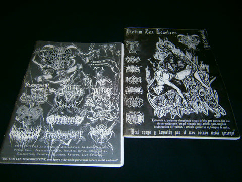 Dictum Les Tenebres # 1 (2007) & 2 (2009) Underground Chilean fanzine with 64 pages each fanzine written in Spanish featuring Vol I interviews with Necropsia, Ritual Desecration, Abrekadaver, Arsenius, Putrid Skull, Frost Demonstorm, Inhumed, Occidens, Maledictum and Vol II Kratherion, Slaughtbbath, Sangre de Lobo, Postmortem, Dies Irae, Odrum, Methapysis, Nergal, Demonic Rage, Suicide Note, Megiddo + A lot of demos, CDs reviews and concert reviews. Limited Edition comes with glossy cover and offsets printed. Essential for Collectors. Recommended!!