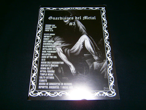 Guardianes del Metal # 3 Underground fanzine from Bolivia edited in 2020 in Spanish Language with 60 pages with interviews to Impurity, Esbbat, Bestymator, Ceremonial Serenade, Blasphemator, Artilleros 666, Dark Paramount, Hellspeed, Signs of the Evil, 1979, Nekro Cult Desecration, Serpente Profana, Ekron Cult, Ritual Funebre, Templo Negro, Kulto Satanas, Ezurate + concerts reviews + demo, CDs reviews and more. Limited Edition comes with glossy cover and offsets printed pages. Recommended!!