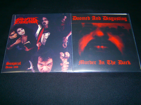 Sadistik Exekution / Doomed and Disgusting - Suspiral demo 1991 / Murder in the Dark. 7" split EP vinyl format released in 2014 between these 2 Australian hordes. Limited Edition comes on black vinyl with double-sided foldover cover lyrics included. Recommended for fans of Order from Chaos, Angelcorpse and Mortuary Drape.